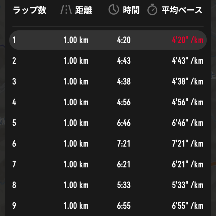 荷物背負っているとはいえ、最初4’20″/kmでも余裕なかったです💦