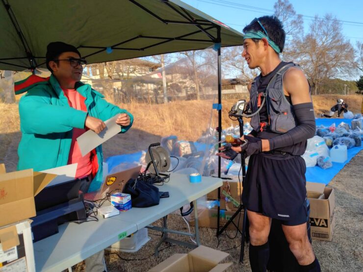 本大会はエイドOUTで計測。最終回走者の証としてのタスキを受け取り、出発します!