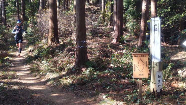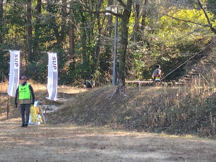 登り返しの先で少しだけ民家の敷地を通させてもらうコースになっていて、ココは歩行指定区間。歩行のついでに補給も済ませます。歩行指定区間の先でロードを渡りトレイルなど登りパートへ。しばらく登るとゆうパークおごせに向かって下り基調です。